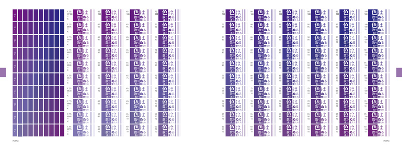 この本は13のカラーグループからイメージから近い色を見付け、さらに大小、濃淡に変化をつけることでより実践的な使いかたに即した、色の見本帳です。カラーグループは、赤・紫・ピンク・黄緑・緑・青・黄・オレンジ・金・銀・淡色(1)・淡色(2)・濃色 の13種。ここからさらに100色ずつの詳細チャートが用意されています。